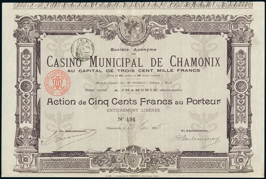 Casino Municipal de Chamonix. Action F500, Chamonix 25.4.1905, #496. EF.