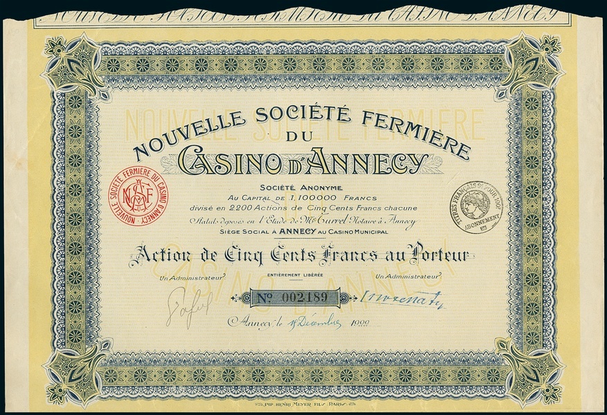 Casino Municipal de Menton. Lot 2 items. Action F100, Menton 20.11.1908 & 6.10.1909, #02883 & 15878. EF.