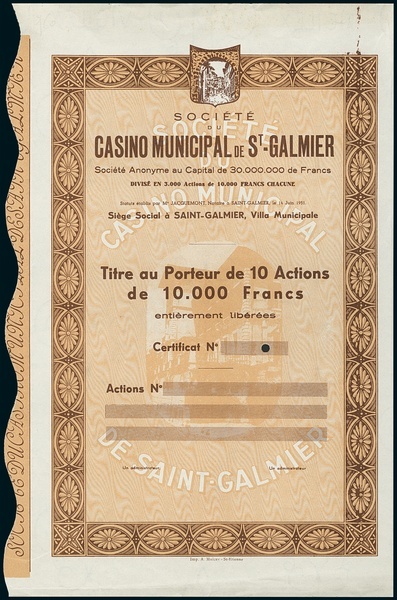 Casino Municipal de St-Galmier. Lot 2 different items. a) 10 Actions de F10'000, Saint-Galmier 14.6.1951, EF; b) Action nominative F10'000, EF.