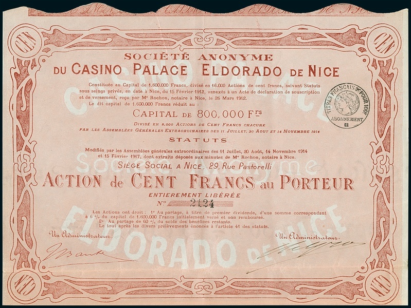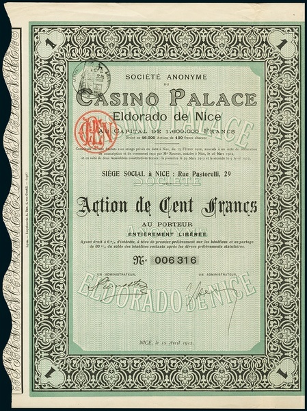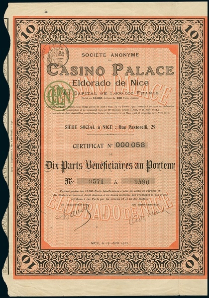 Casino Palace Eldorado de Nice. Lot 3 different items. a) Action F100, Nice 15.4.1912, #006316, EF; b) 10 Part Bénéficiaires, Nice 15.4.1912, Cert. #000058, EF; c) Action F100, 15.2.1917, #2124, EF.