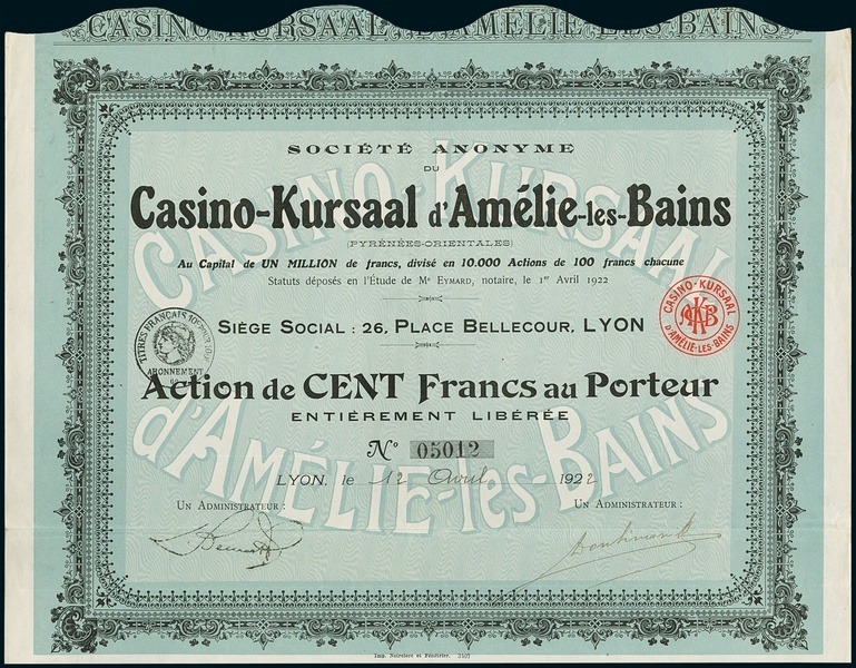 Casino-Kursaal d'Amélie-les-Bains. Action F100, Lyon 12.4.1922, #05012. EF.
