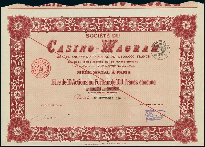 Casino-Wagram. 10 Actions de F100, Paris 30.9.1926, #09071-80. EF