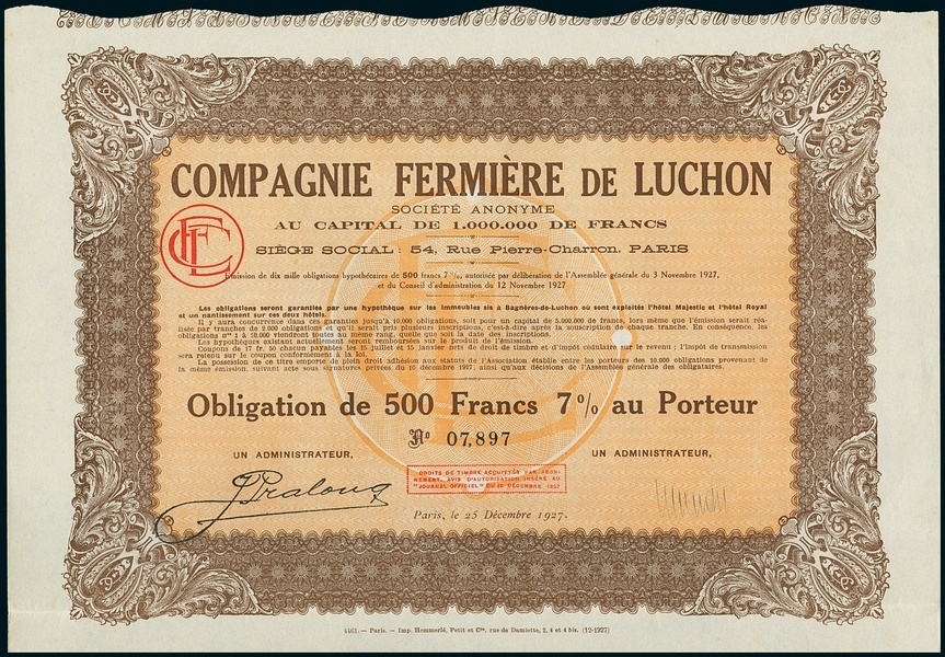 Compagnie fermière du Luchon. 7% Obligation F500, Paris 25.12.1927, #07897. EF.