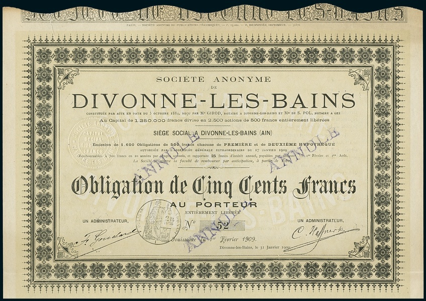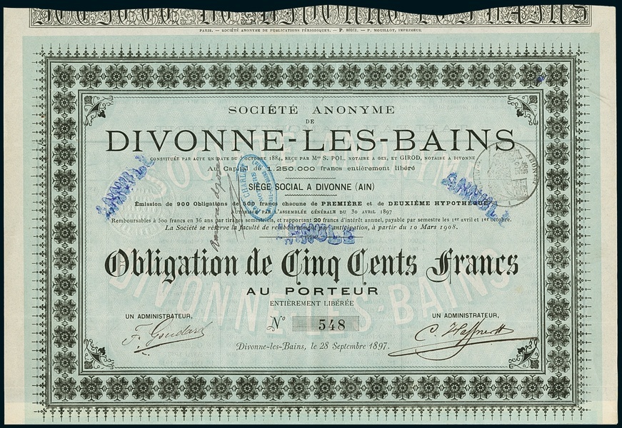 Divonne-Les-Bains. Lot 2 different items. a) Obligation F500, Divonne-les-Bains 28.9.1897, #548. EF. b) Obligation F500, 31.1.1909, #52. EF.