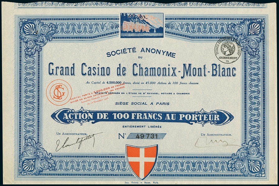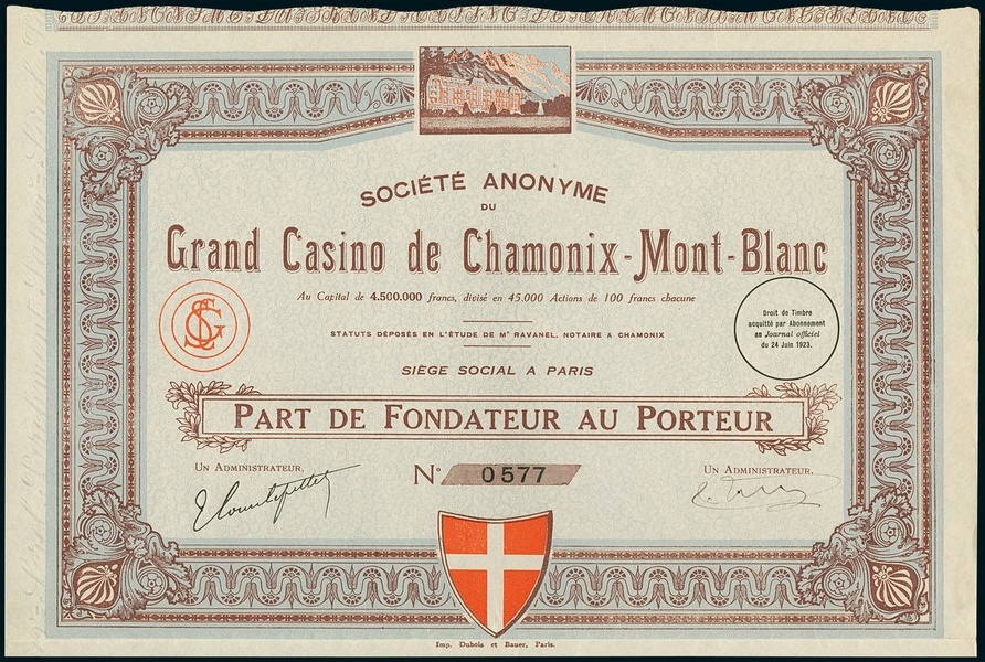 Grand Casino de Chamonix-Mont-Blanc. Lot 2 different items. a) Part de Fondateur, Paris 24.6.1923, #0577, EF. b) Action F100, #49731, EF.
