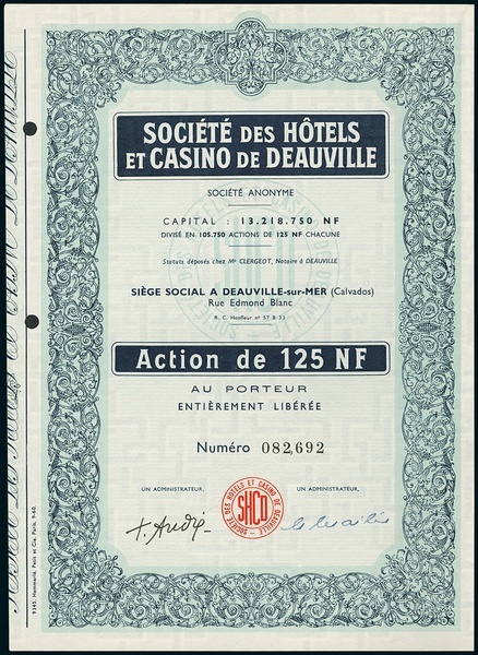 Hôtels et Casino de Deauville, (Lot 2 items), a) Action F2500, Deauville-sur-Mer, unissued; b) Action NF125, #082692; both EF.