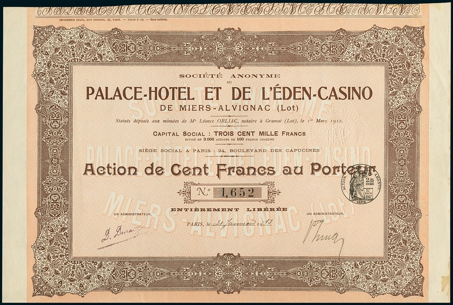 Palace-Hotel et l'Eden-Casino. Action F100, Paris 31.1.1913, #1652. Stains right border, EF.
