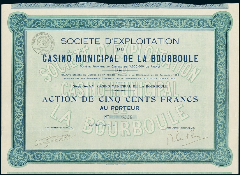 Société d'Exploitation du Casino Municipal de la Bourboule. Action F500, La Bourboule 27.1.1928, #6338. EF.