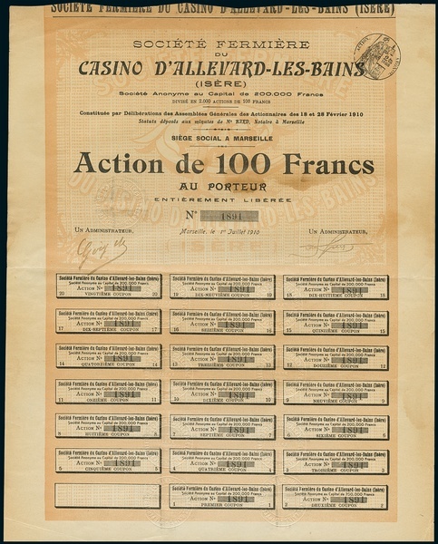 Société Fermière du Casino d'Allevard-Les-Bains. Action F100, Marseille 1.7.1910, #1891, Stains, Good.