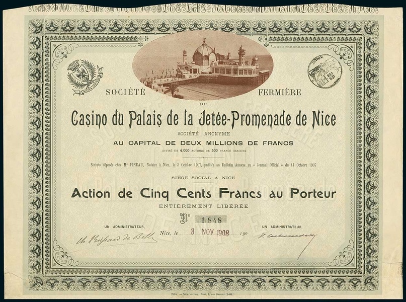 Société Fermière du Casino du Palais de la Jetée-Promenade de Nice. Action F500, Nice 3.11.1908, #1848, tear through paper professionally repaired, VF.