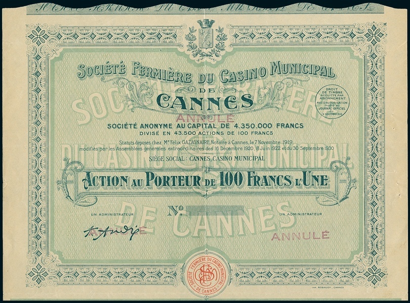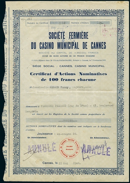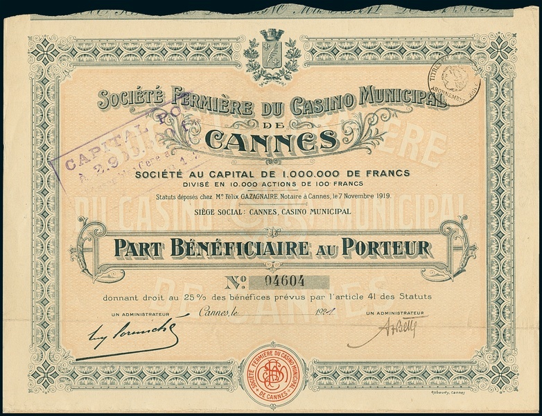 Société Fermière du Casino Municipal de Cannes. Lot 4 different items. a) Part Bénéficiaire, Cannes 1921, #04604, EF b) Action F100, 1930, unissued c) Cert. d'Actions F100, 11.4.1948, #256, VF d) Action F2500, unissued, EF.