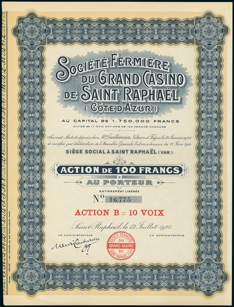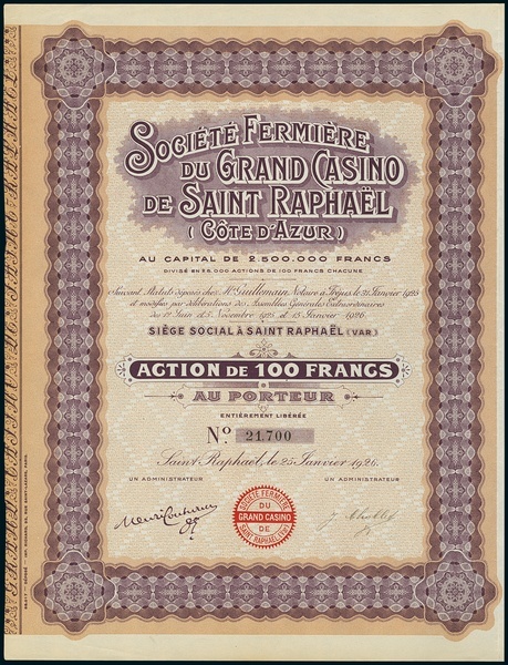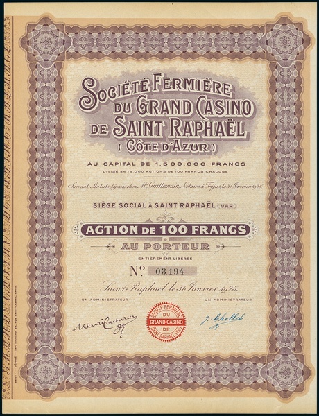 Société Fermière du Grand Casino de Saint Raphaël (Côte d'Azur). Lot 4 different items. a) Action F100, Saint Raphaël 31.1.1925, #03194, EF b) Action F100, Action B= 10 voix, 13.7.1925, #16775, EF c) Part de Fondateur, 25.1.1926, #01524 EF d) Action F100, 25.1.1926, #21700, EF. Well known resort at the Côte d'Azur.