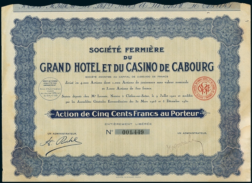 Société Fermière du Grand Hotel et du Casino de Cabourg. Action F500, Châlon-sur-Saône 5.12.1930, #001449, Stained, tears, Good.