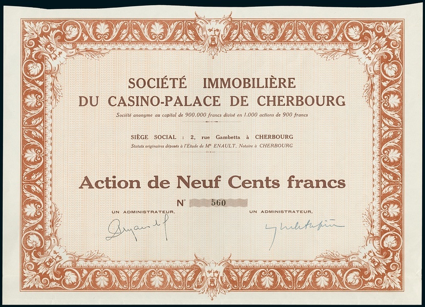 Société Immoblière du Casino-Palace de Cherbourg. Action F900, Cherbourg ca. 1925, #560, EF.