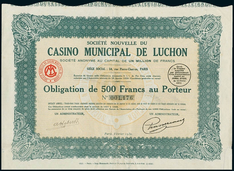 Société Nouvelle du Casino Municipal de Luchon. 6½% Obligation F500, Paris Février 1930, #001176, EF.