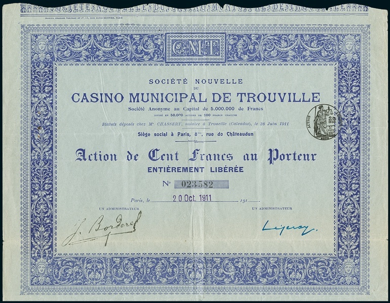 Société Nouvelle du Casino Municipal de Trouville. Lot 2 items. Action F100, Paris 18 & 20.10.1911.