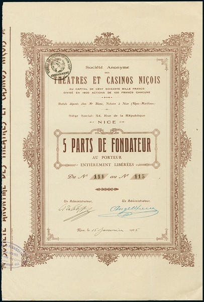 Théatres et Casinos Niçois. Lot 2 different items. a) 5 Part de Fondateur, Nice 15.1.1925, #111-115, EF. b) 5 Actions F100, Nice 15.1.1925, #1071-75, EF.