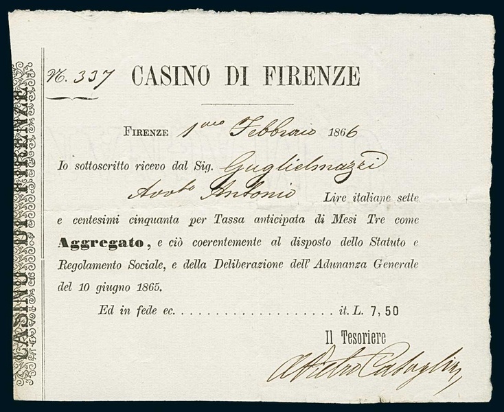 Casino di Firenze. Receipt for payment.Firenze 1.2.1866, #337. VF.