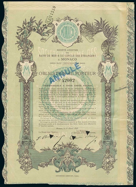 Bains de Mer et Cercle des Étrangers à Monaco. 4% Obligation F300, Monaco 1.4.1898, #42002. VF.