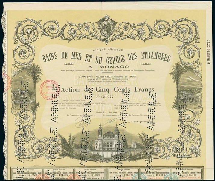 Bains de Mer et Cercle des Étrangers à Monaco. Action F500, Monaco 1.8.1942, #121022. Canceling holes, small tear in fold. VF.