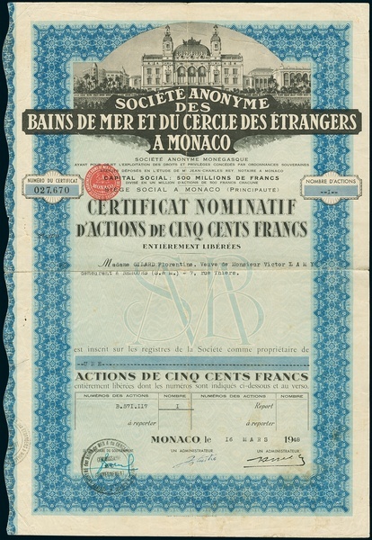 Bains de Mer et Cercle des Étrangers à Monaco. Certificat Nominatif d'Action F500, Monaco 16.3.1948, #027670, tears repaired. VF.