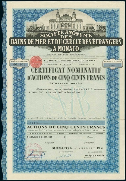 Bains de Mer et Cercle des Étrangers à Monaco. Certificat Nominatif d'Action F500, Monaco 21.7.1947, #001101. VF.