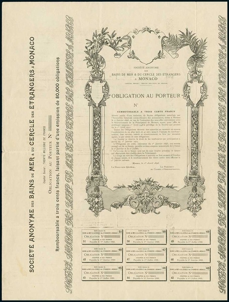 Bains de Mer et du Cercle des Etrangers à Monaco. Obligation F300, Monaco 1.4.1898, unissued. EF.