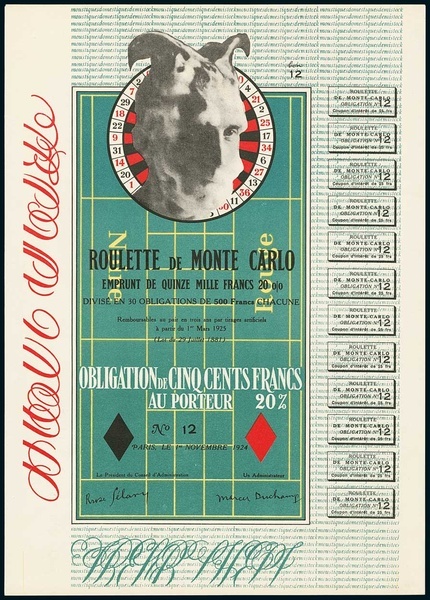 Roulette de Monte Carlo. 20% Obligation F 500 au Porteur. Paris, 1 Novembre 1924, Nr. 12. This certificate is one of the colour reproductions of No. 12 made for inclusion in "The Box in a Valise" by Arturo Schwarz in 1941. With printed signature of Marcel Duchamp (1887-1968), probably one of the most important artist of the 20th century. He founded the company in November 1924 to finance his new passion for Roulette and his project to break the bank of the Casino in Monte Carlo.EF.