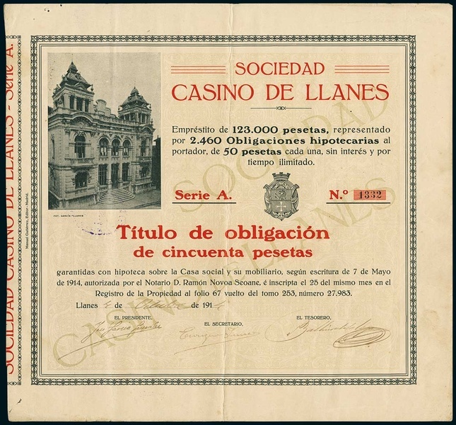 Casino de Llanes. Obligación Serie A Ptas 50, Llanes 1.10.1914, #1332. EF