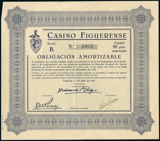 Casino Figuerense. Obligación Amortizable Ptas 50, Figueras 1.7.1943, #1092. EF.