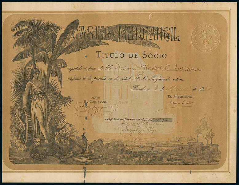 Casino Mercantil. Titulo de Sócio, Barcelona 9.5.1890. The casino was built in 1881. It became a School of Applied Arts in 1960. Professionally repaired, holes. VF.