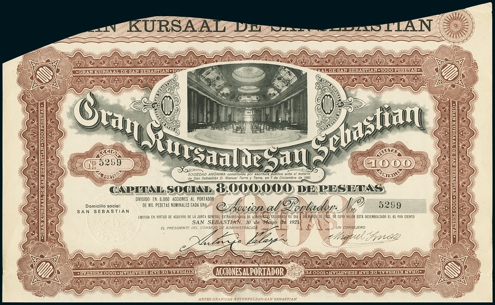 Gran Kursaal de San Sebastian. Accion Ptas 1000, San Sebastian 20.5.1923, #5299. The company was formed in 1922 to acquire the great casino of San Sebastian, then the summer residence of the royal family. EF.