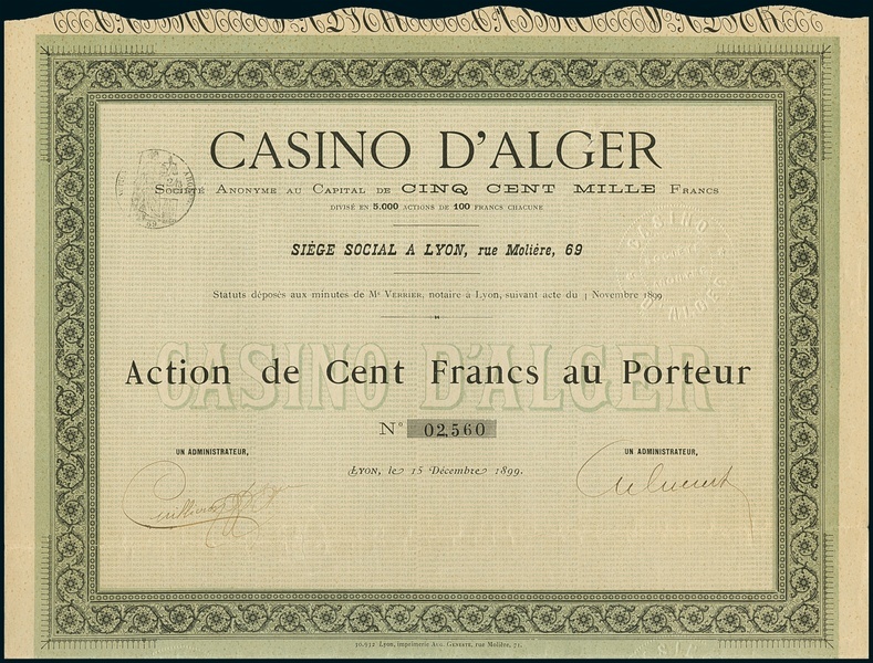Casino d'Alger. Action de F100, Lyon 15.12.1899. #02560. EF.