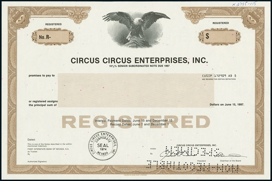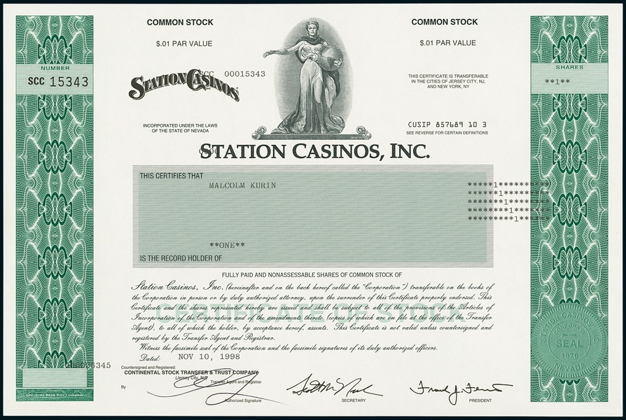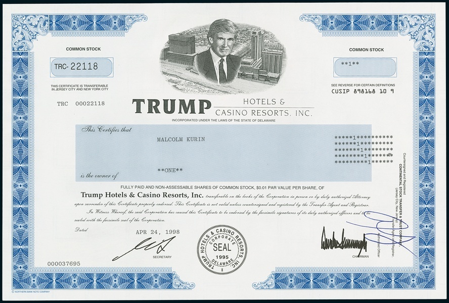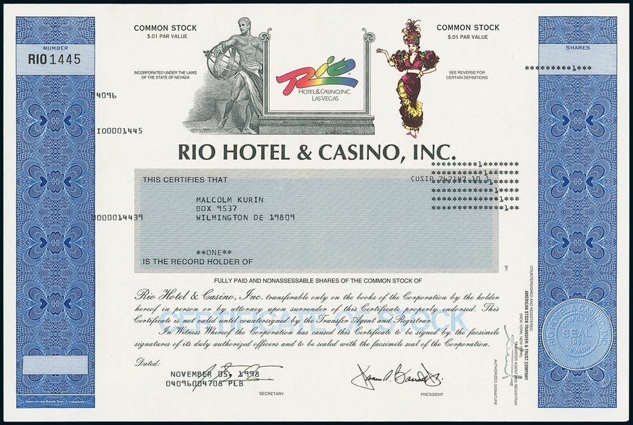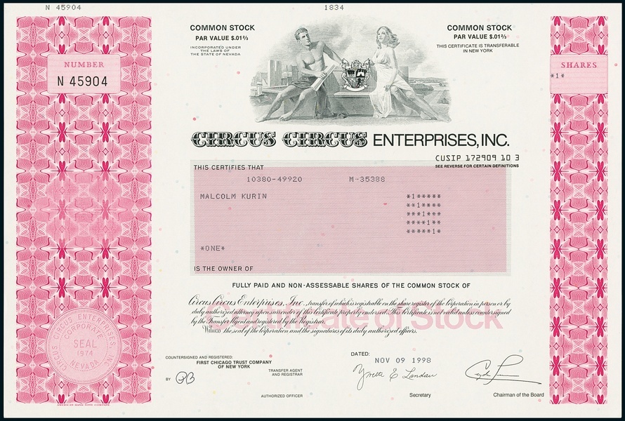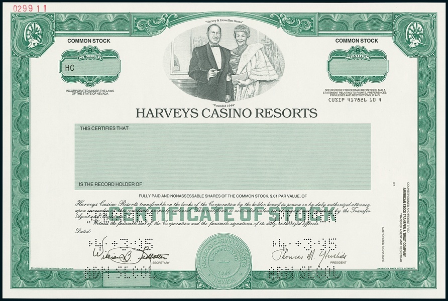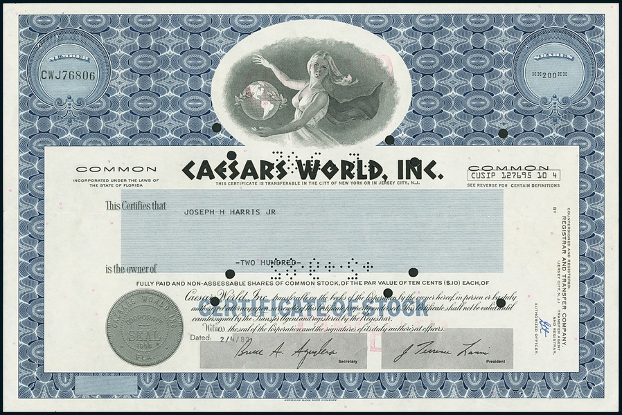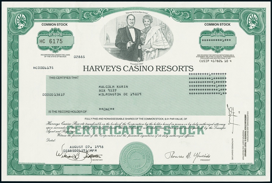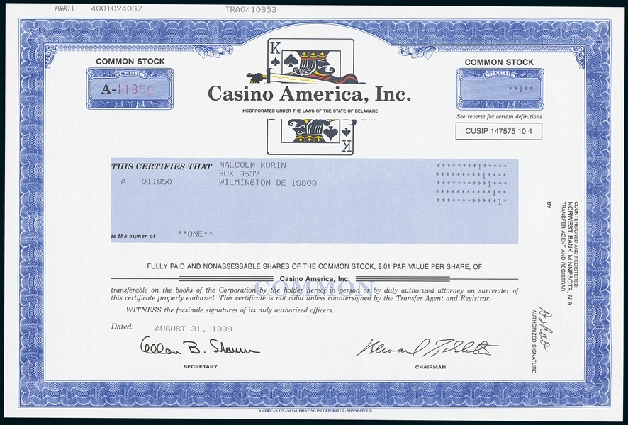 Collection of 17 US-Casiono stocks. (17) Boyd Gaming Corporation. Common Stock, Nevada, unissued. UNC. Caesars World, Inc. 200 Shares Common Stock, Florida 2.4.1982, #CWJ76806. Founded in 1958. Today one of the biggest manager of Casinos and Hotels worldwide. EF. Caesars World, Inc. 12½% Senior Subordinated Sinking Fund Debenture, Florida, Specimen. UNC. Casino America, Inc. One Share Common Stock, Delaware 31.8.1998, #A-11850. EF. Casino Magic Corporation. One Share Common Stock, Minnesota 31.8.1998, #9889. EF. Circus Circus Enterprises, Inc. One Share Common Stock $ 0.01 2/3, Nevada 9.11.1998, #N45904. Founded in 1974. EF. Circus Circus Enterprises, Inc. 10 5/8% Senior Subordinated Note, Nevada, unissued. UNC. Grand Casinos, Inc. One Share Common Stock $0.01, Minnesota 13.8.1998, #GC 20226. The company has taken over by Hilton Hotels in 1998. EF. Greate Bay Casino Corporation. Common Stock $0.01, Delaware, Specimen, UNC. Harveys Casino Resorts. One Share Common Stock $0.01, Nevada 7.8.1998, #HC 6175.EF. Harveys Casino Resorts. Common Stock $0.01, Nevada, unissued. UNC. Isle of Capri Casinos, Inc. One Share Common Stock $0.01, Delaware 26.1.1999, #A-13045. EF. Rio Hotel & Casino, Inc. One Share Common Stock $0.01, Nevada 5.11.1998, #RIO1445. EF. Showboat, Inc. 13% Subordinated Sinking Fund Debenture, Nevada, unissued. UNC. Station Casinos. One Share Common Stock $0.01, Nevada, #SCC15343. EF. Trump Hotels & Casino Resorts, Inc. One Share Common Stock, Delaware 24.4.1998, #TRC-22118. Company of the well-known property Tycoon, Donald Trump. EF.