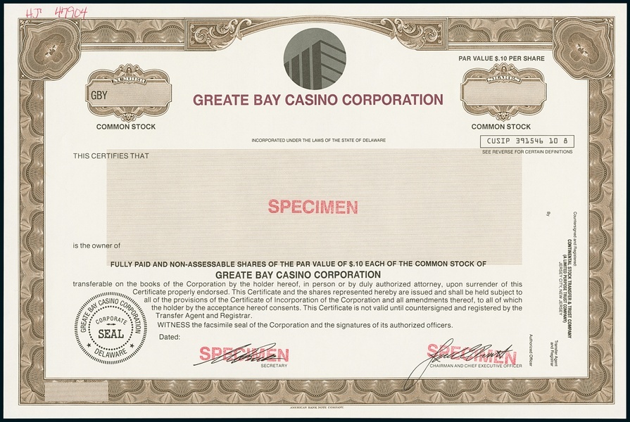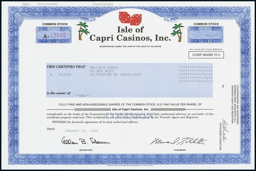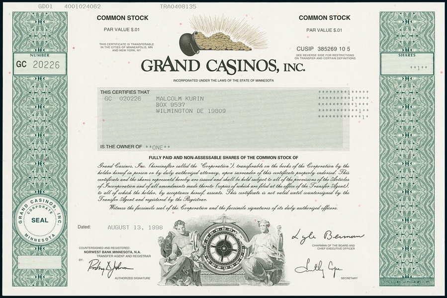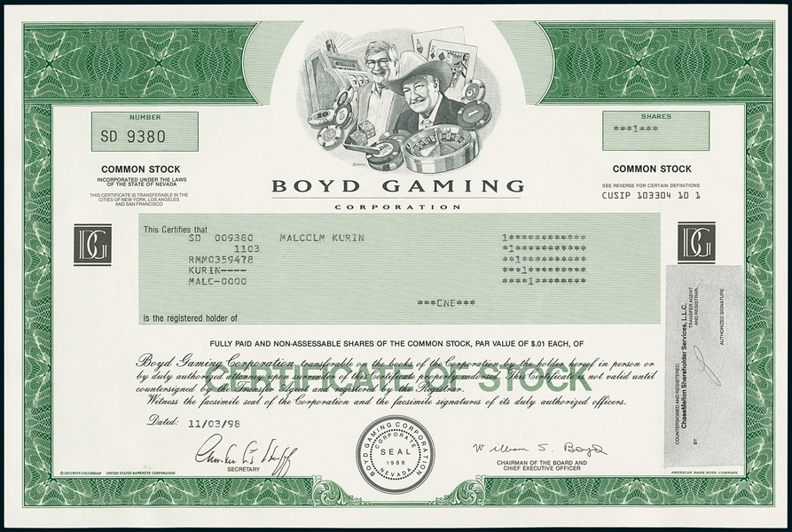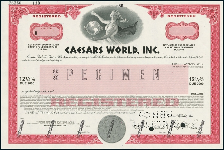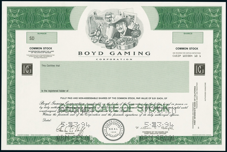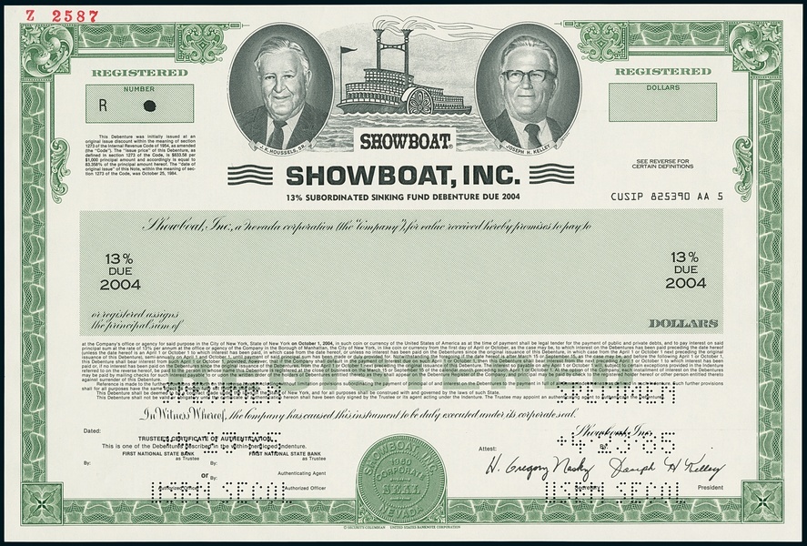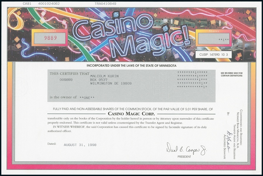 Collection of 17 US-Casiono stocks. (17) Boyd Gaming Corporation. Common Stock, Nevada, unissued. UNC. Caesars World, Inc. 200 Shares Common Stock, Florida 2.4.1982, #CWJ76806. Founded in 1958. Today one of the biggest manager of Casinos and Hotels worldwide. EF. Caesars World, Inc. 12½% Senior Subordinated Sinking Fund Debenture, Florida, Specimen. UNC. Casino America, Inc. One Share Common Stock, Delaware 31.8.1998, #A-11850. EF. Casino Magic Corporation. One Share Common Stock, Minnesota 31.8.1998, #9889. EF. Circus Circus Enterprises, Inc. One Share Common Stock $ 0.01 2/3, Nevada 9.11.1998, #N45904. Founded in 1974. EF. Circus Circus Enterprises, Inc. 10 5/8% Senior Subordinated Note, Nevada, unissued. UNC. Grand Casinos, Inc. One Share Common Stock $0.01, Minnesota 13.8.1998, #GC 20226. The company has taken over by Hilton Hotels in 1998. EF. Greate Bay Casino Corporation. Common Stock $0.01, Delaware, Specimen, UNC. Harveys Casino Resorts. One Share Common Stock $0.01, Nevada 7.8.1998, #HC 6175.EF. Harveys Casino Resorts. Common Stock $0.01, Nevada, unissued. UNC. Isle of Capri Casinos, Inc. One Share Common Stock $0.01, Delaware 26.1.1999, #A-13045. EF. Rio Hotel & Casino, Inc. One Share Common Stock $0.01, Nevada 5.11.1998, #RIO1445. EF. Showboat, Inc. 13% Subordinated Sinking Fund Debenture, Nevada, unissued. UNC. Station Casinos. One Share Common Stock $0.01, Nevada, #SCC15343. EF. Trump Hotels & Casino Resorts, Inc. One Share Common Stock, Delaware 24.4.1998, #TRC-22118. Company of the well-known property Tycoon, Donald Trump. EF.