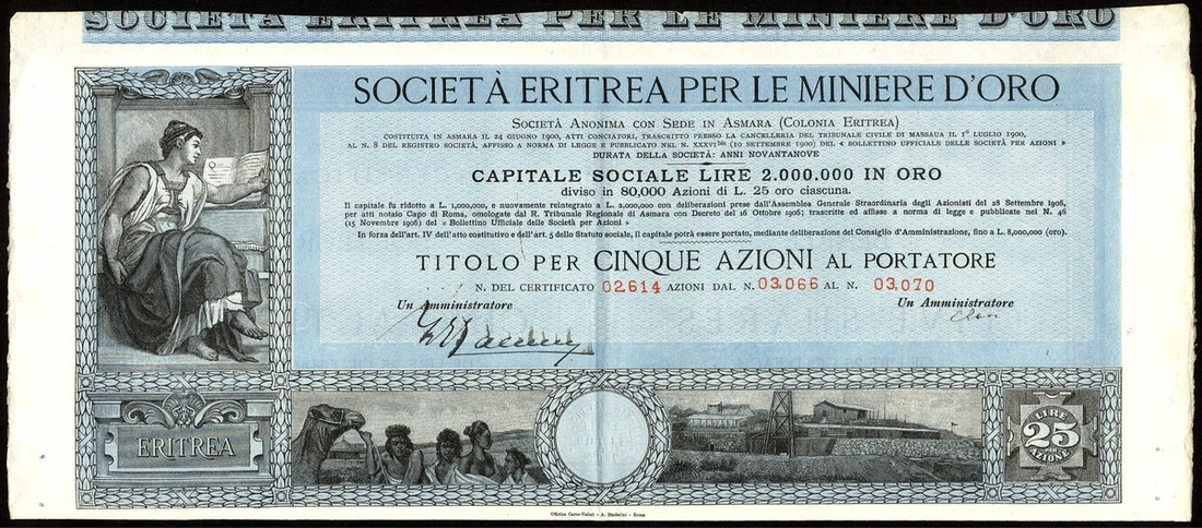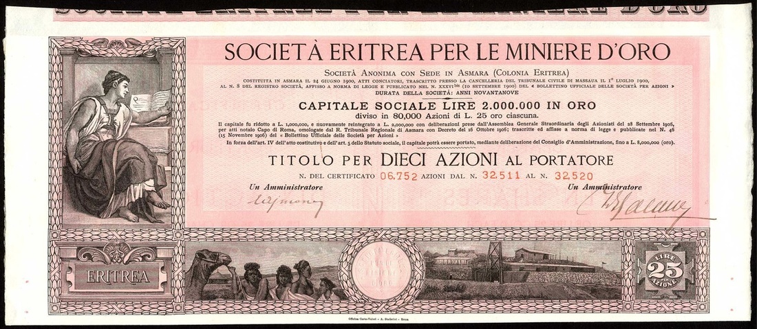Eritrea: Societa Eritrea per le Miniere d'Oro, a pair of certificates for 10 and 5 bearer shares of 25 lire each, pink and blue respectively, attractive pieces with allegorical figure at left and vignette depicting mine site and African women with camel across bottom, both with copupons, good very fine. (2)