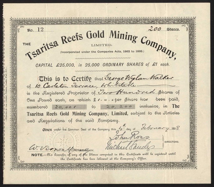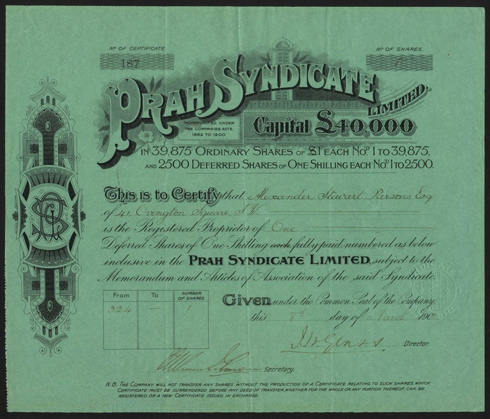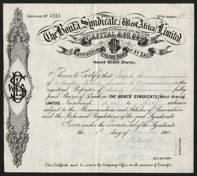 West African Gold Mining, comprising Prah Syndicate Ltd., 1 shilling deferred shares, 190[1]; Tsaritsa Reefs Gold Mining Co. Ltd., £1 shares, 189[8]; African (Sefwi) Gold Mining Co. Ltd., £1 shares, 189[4]; Bonta Syndicate (West Africa) Ltd., 5 shilling shares, 190[1]; Andrews Wassau Concessions Syndicate Ltd.,£1 shares, 190[1]; Dansebu Gold Mining Co. Ltd., 190[3]; Tarkwa Consols, Ltd., 19[11]; Obbuassi Syndicate Ltd., 190[3]; Guinea Coast Gold Mining Co. Ltd., 188[2]; Guinea Coast Exploration Syndicate Ltd., 190[2], and Ivory Coast Goldfields Ltd., 190[1], generally about very fine. (11)