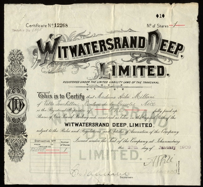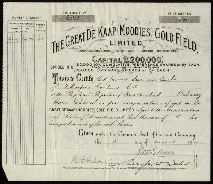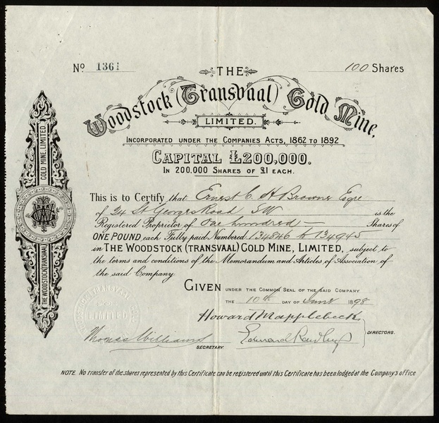 A group of Gold Mines in the Transvaal, (20), comprising Black Reef Proprietary Co. Ltd., 189[6]; Afrikander Gold Mining Co. Ltd., [1897]; Woodstock (Transvaal) Gold Mine Ltd., 18[98]; Great De Kaap (Moodies) Gold Field Ltd., 19[02]; Witwatersrand Deep Ltd., [1909]; Midas Deep Ltd., 19[11]; Klerksdorp Extended Ltd., 190[7]; Sutherland Reef Ltd., 190[5]; O. R. C. Gold Reefs Syndicate Ltd., 190[3]; Nigel Main Reef Ltd., 1[902]; Lancaster West Gold Mining Co. Ltd., 19[05]; Lisbon-Berlyn Ltd., 190[2]; Coronation Extension Syndicate (Transvaal) Ltd., [1903]; Eastern Extension Mining and Exploration Co. Ltd., 190[5]; Great Britain Gold Mining & Estate Co. of Witwatersrand Ltd., 189[5]; Southern Coronation Syndicate Ltd., 19[03]; Robinson Gold Mining Co. Ltd., [1902]; Rand Central Ore Reduction Co. Ltd., 189[5]; Roodepoort Gold Mining Co. Ltd., 18[97], and Randfontein Estates Gold Mining Co. Witwatersrand Ltd., 18[99], fine to very fine at best. (20)