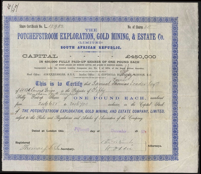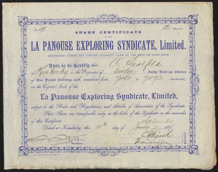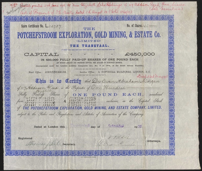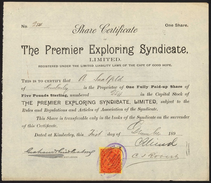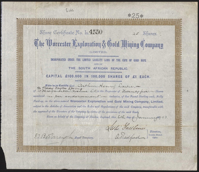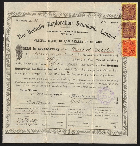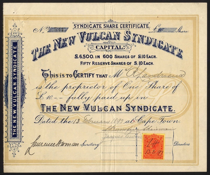 A small group of locally registered companies, comprising Bethulie Exploration Syndicate Ltd., £1 shares, Cape Town 189[6]; La Panouse Exploring Syndicate Ltd., £1 shares, Kimberley 189[8]; New Vulcan Syndicate, £10 share, Cape Town [1897]; Potchefstroom Exploration Gold Mining & estate Co. Ltd., £1 shares, 18[97] and 19[06]; Premier exploring Syndicate Ltd., £5 share, Kimberley 189- (date omitted in error); Vaarwel Prospecting Syndicate, £10 shares, of only 100 issued, 1895, and, Worcester Exploration & Gold Mining Co. Ltd., £1 shares, 18[903], the last with corner missing otherwise very fine or thereabouts. (8)