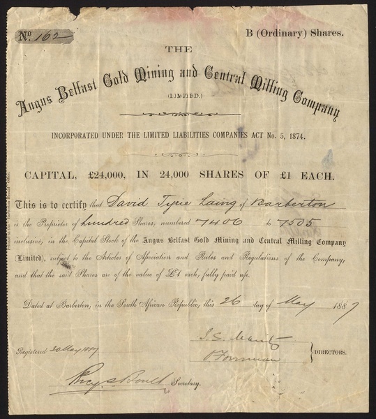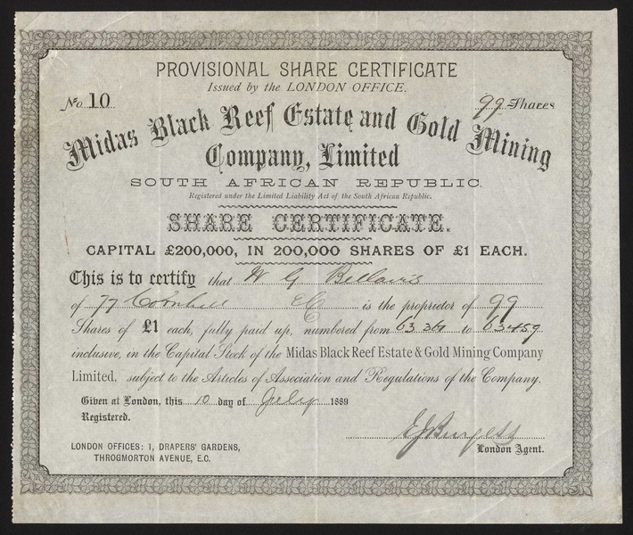 A small group of South African Mines (10), comprising Tharsis Gold Mining Co. Ltd., 188[9]; Midas Black Reef Estate and Gold Mining Co. Ltd., 1889; "Republic" Gold Mining Syndicate Ltd., 18[88]; Inland Sea Estate and Gold Mining Syndicate, [1896]; Cornucopia Gold Mining Co. Ltd., 188[8]; Consort Reef Gold Mining Co. Ltd., [1888]; Doornfontein Mint Gold Mining Co. Ltd., 188[9]; Angus Belfast Gold Mining and Central Milling Co. Ltd., 188[7]; Victory Gold Mining Co. Ltd., [1886], and Meyer and Leeb Gold Mining Co. Ltd., 189[1], fine to very fine at best. (10)