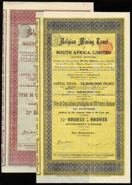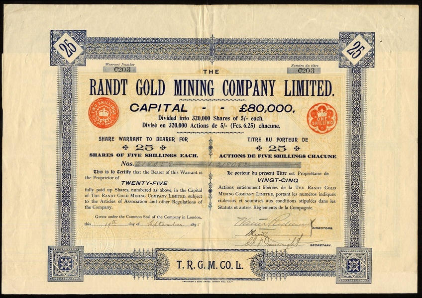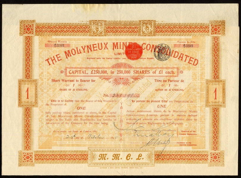 South African bearer certificates, comprising Randt Gold Mining Co. Ltd., 189[5]; Belgian Mining Trust of South Africa Ltd., 1895 (2); Molyneux Mines Consolidated Ltd., 189[5]; New Rip Gold Mining Co. Ltd., 190[3]; Transvalia Land Exploration and Mining Co. Ltd., 18[89]; Rose Deep Ltd., [1901]; Buffelsdoorn Estate & Gold Mining Co. Ltd., 1[899]; Henderson's Nigel Ltd., 189[5]; Marie Louise Gold Mines Ltd., 189[5]; Treasury Gold Mines Ltd., specimen, 189[-]; Transvaal Consolidated Land & Exploration Co. Ltd., [1903] (this one only fine); Niekerk (Klerksdorp) Gold Mining Co. Ltd., 189[5], and Langlaagte Proprietary Co. Ltd., part issued, 189[-], very fine unless stated. (14)