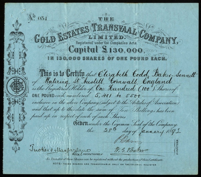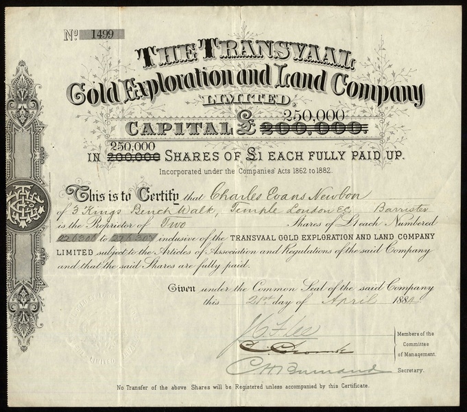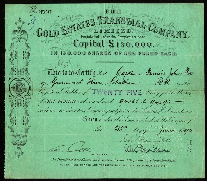 Transvaal Mining, comprising Gold Estates (Transvaal) Co. Ltd., 18[92] (part paid) and 18[90] (fully paid); Transvaal Gold Exploration and Land Co. Ltd., 188[4] and 188[5] (different capital); Graskop Mill & Mining Co. Ltd., 189[1]; Graskop Ltd., 1899 (part paid) and 189[8] (fully paid); Umtoli Gold Reefs Co. Ltd., 18[95]; Mapootaland Syndicate Ltd., 18[89]; Graskop Exploring Co. Ltd., 189[6]; Silati River Gold Mining and Prospecting Co. Ltd., 189[-]; Silati Gold Mining Co. Ltd., 189[4]; Malmani Gold Syndicate Ltd., 189[5], and paperwork relating to Charterland Goldfields Ltd.; Scottish African Trust, and Coetzeestroom Estate and Gold Mining Co. Ltd., fine to very fine. (14)