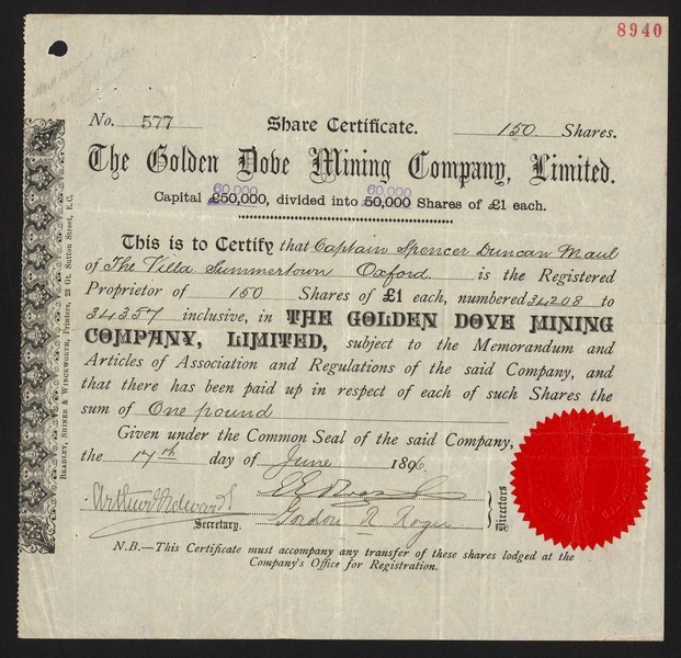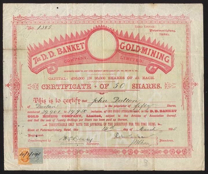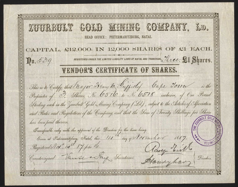 Zuurbult Gold Mining Co. Ltd., £1 shares, 18[87], ornate border, black, together with other gold mining companies in the Natal Region of South Africa comprising; Golden Dove Mining Co. Ltd., 189[6]; D. D. Banket Gold Mining Co. Ltd., 189[5]; New Heriot Gold Mining Co. Ltd., 191[2]; Steyn's Kraal Gold Mining Co. Ltd., 18[95]; Salisbury Gold Mining Co. Ltd., 1[904], 190[6] and 19[10] (2); New Romola Gold Mining Co. Ltd., 190[4]; City & Suburban Gold Mining & Estate Co. Ltd., [1902] (2), ranging from fine to very fine. (12)