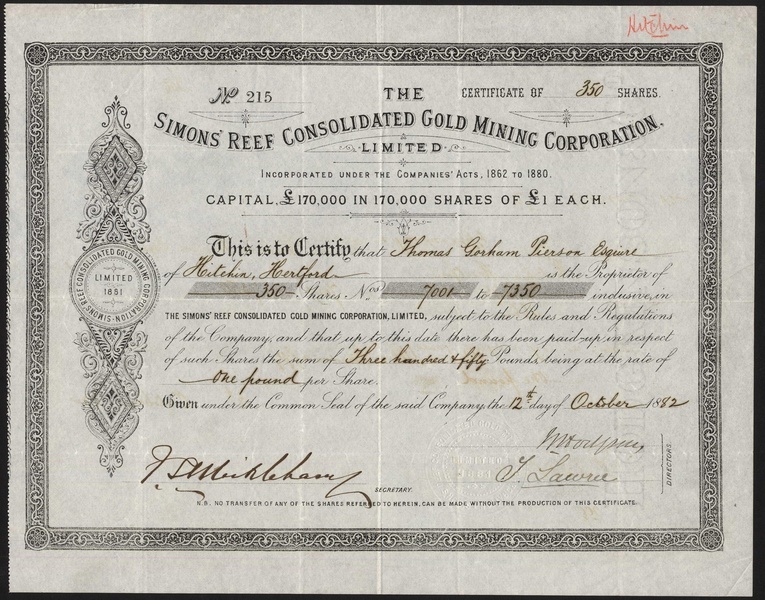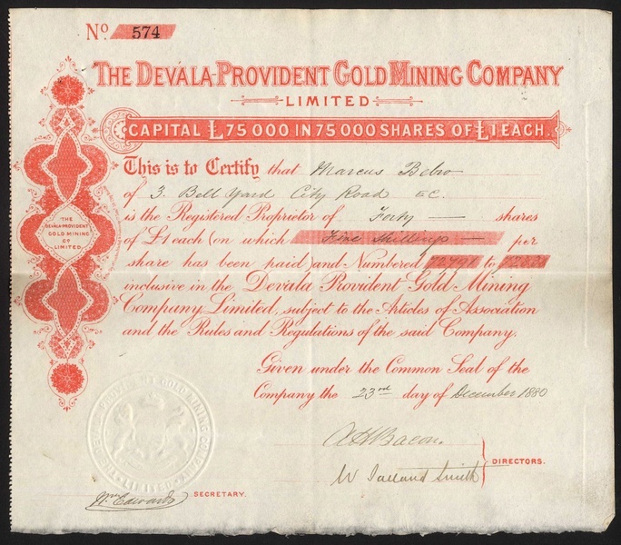 India & Burma, comprising; Simons' Reef Consolidated Gold Mining Corporation Ltd., £1 shares, 18[82], black; Devala Provident Gold Mining Co. Ltd., £1 shares, [1880], red; South-East Mysore Gold Co. Ltd., £1 shares, 188[8], black; Glenrock Co. Ltd., £1 shares, 18[86], black; Cootacovil Gold Mining Co. Ltd., £1 shares, 188[3], black; Perseverance Gold Co. Ltd., £1 shares, 189[1], black; Perseverance Gold Mining Co. Ltd., 5% first mortgage debenture for £20, black; Yerrakonda Gold Mining Co. Ltd., 4 shilling shares, 189[5], blue; Sangli Gold Mining Co. Ltd., £1 shares, 190[6], blue, and Burma Ruby Mines Ltd., 12 shilling shares, 19[19], black, generally about very fine. (10)