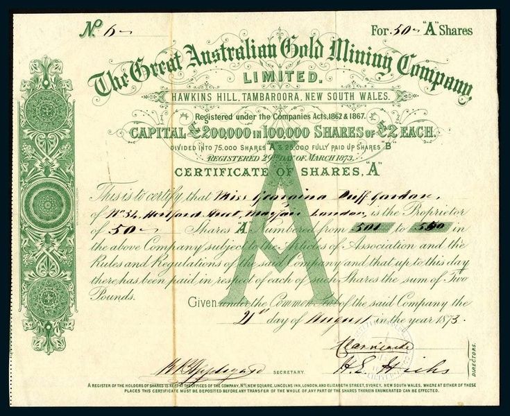 Great Australian Gold Mining Co. Ltd., Hawkins Hill, Tambaroora, New South Wales, certificate of 'A' shares of £2 each, 187[3], ornate scrollwork at left, green, printed by Waterlow & Sons, heavy folds, very fine and rare.