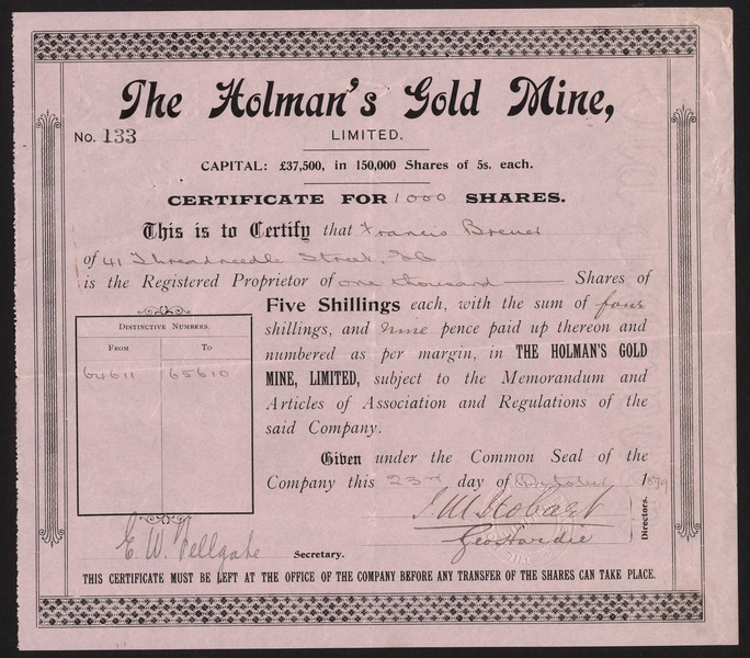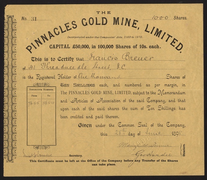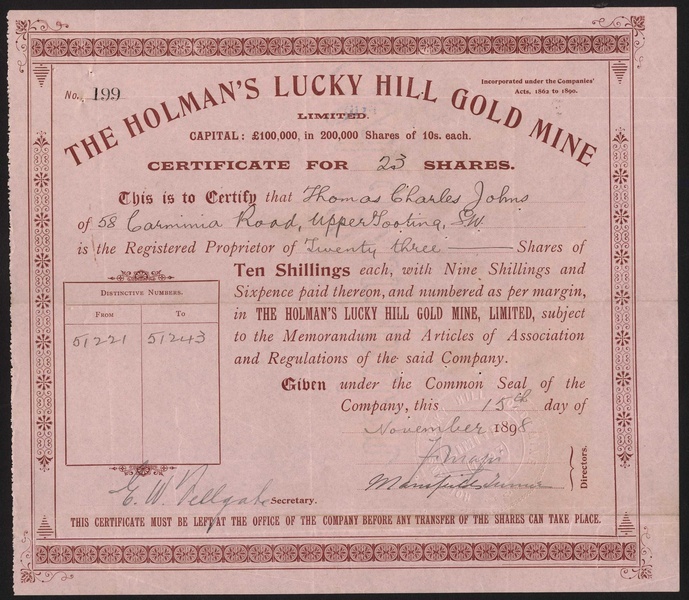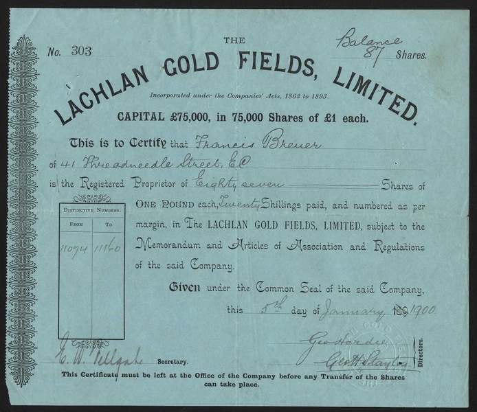 Lachlan Mining District, New South Wales: comprising Lachlan Gold Fields Ltd., £1 shares, [1900], no.303, black on blue paper, together with; Pinnacles Gold Mine Ltd., 10 shilling shares, 189[8], no.31, black on yellow paper; Holman's Gold Mine Ltd., 5 shilling shares, 1[899], no.133, black on pink paper, and Holman's Lucky Hill Gold Mine Ltd., 10 shilling shares, 189[8], no.199, maroon on pink paper, all with pin holes at top but good very fine. (4)