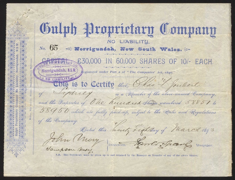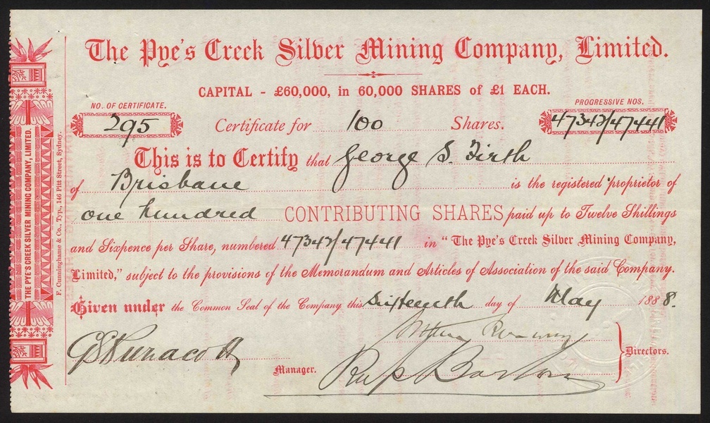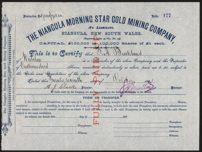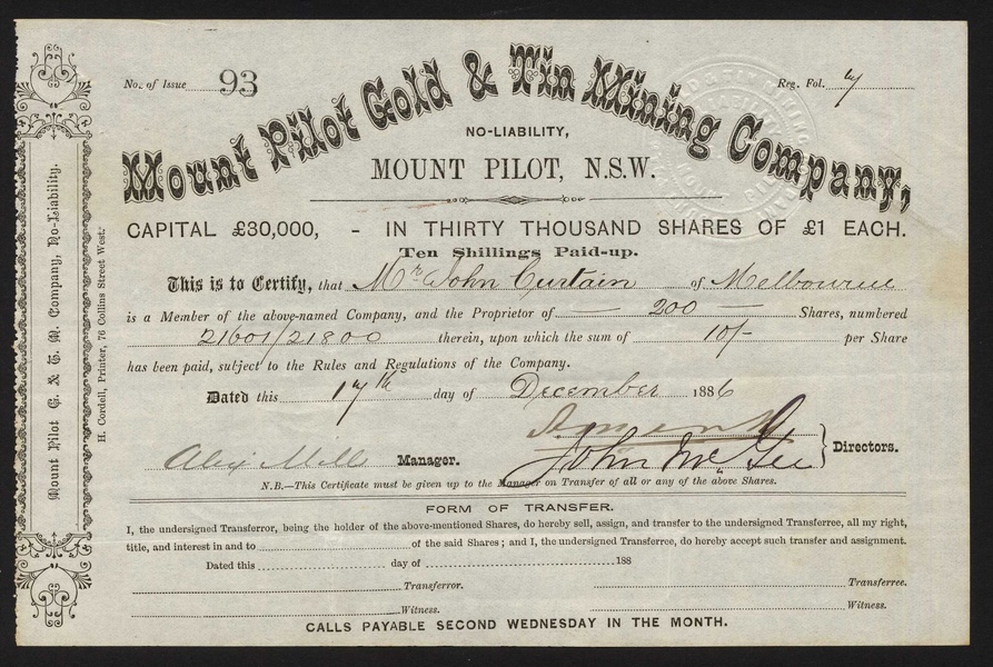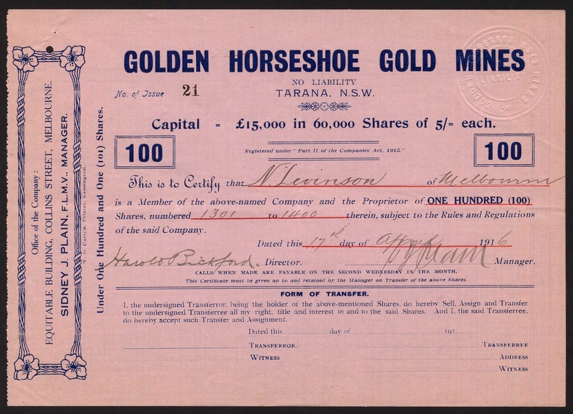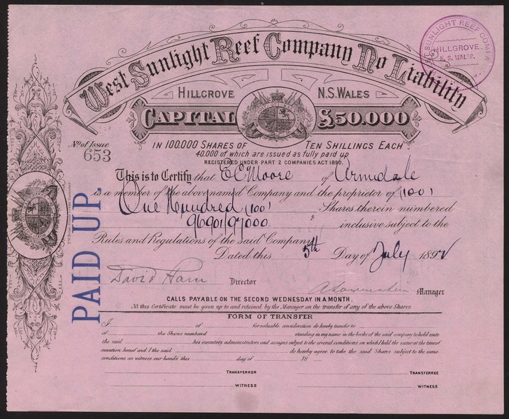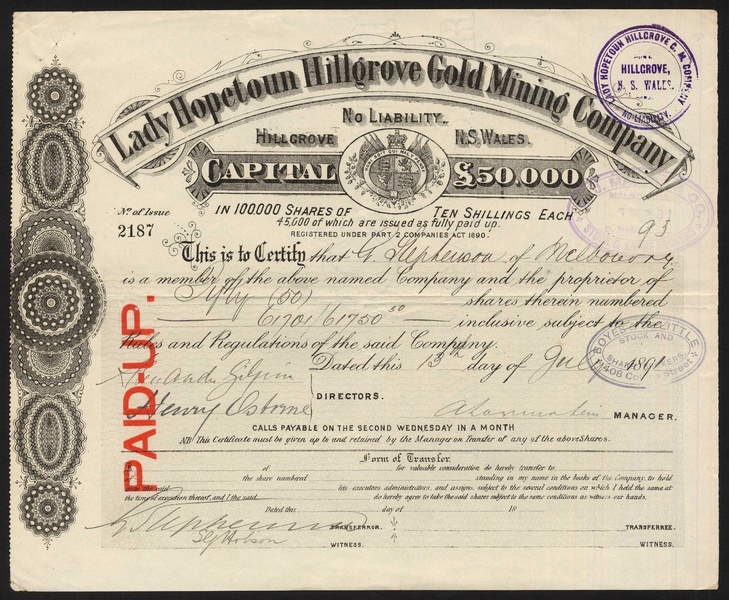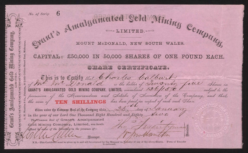 Mines in New South Wales, comprising; West Sunlight Reef Co., 10 shilling shares, 189[7], no.653, black on pink; Niangula Morning Star Gold Mining Co., £1 shares, 189[1], no.177, blue; Grant's Amalgamated Gold Mining Co. Ltd., £1 shares, 188[2], no.6, black on pink; Mount Pilot Gold & Tin Mining Co., £1 shares, 188[6], no.93, black; Pye's Creek Silver Mining Co. Ltd., £1 shares, 188[8], red; Lady Hopetoun Hillgrove Gold Mining Co., 10 shilling shares, 189[1], black; Gulph Proprietary Co., 10 shilling shares, 189[3], blue; Golden Horseshoe Gold Mines, 5 shilling shares, 191[6], blue on pink, and Starlight Gold Mining Co., £1 shares, 189[1], maroon, very fine or better. (9)