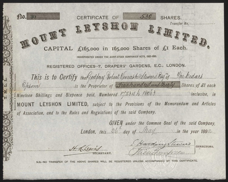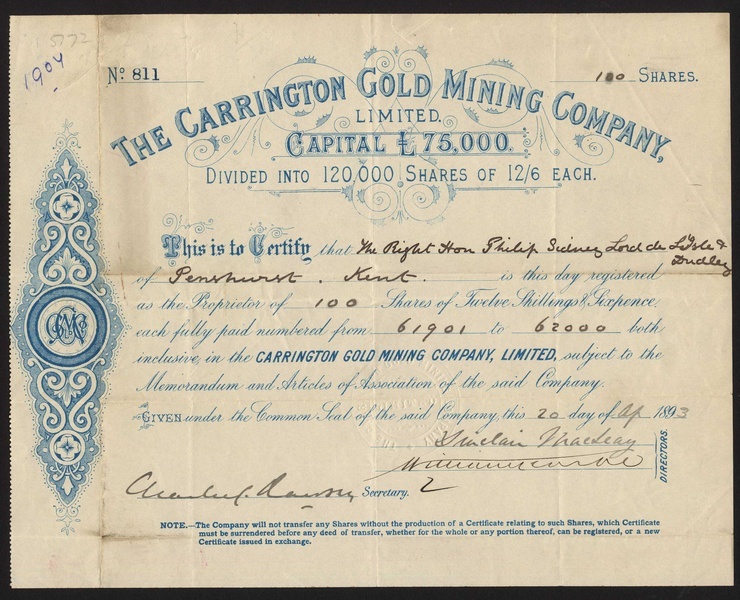 Mining at Charters Towers, Queensland, comprising; Bonnie Dundee Gold Mining Co. Ltd., £1 shares, 188[7], black; Mount Leyshon Ltd., £1 shares, 189[2], black; Carrington Gold Mining Co. Ltd., 12s6d shares, 189[3], blue; Rainbow & Peabody Gold Mines Ltd., £1 shares, 189[7], black; Lady Carrington Gold Mines Ltd., 5 shilling shares, 189[8], black; Union Jack Consolidated Mines Ltd., 5 shilling shares, capital £300,000, [1900], blue and red, and 5 shilling shares, capital £200,000, 1[905], blue and peach, all very fine. (7)