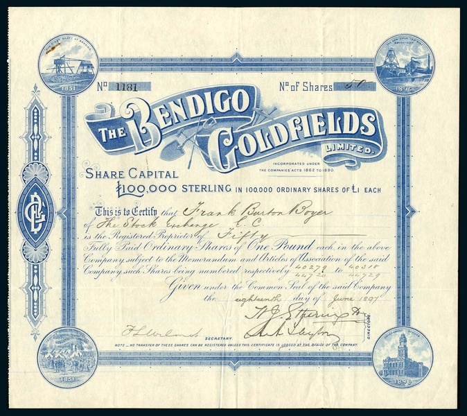 Bendigo Goldfields Ltd., £1 ordinary shares, [1897], no.1181, decorative border with vignettes in corners depicting the mine in 1851 and 1896, blue, good very fine.