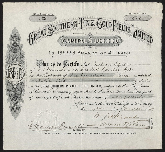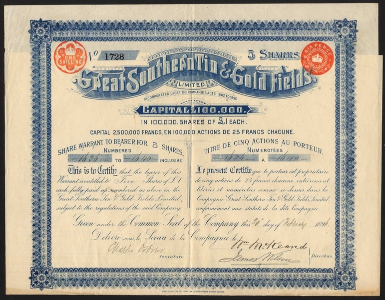 Victoria: Great Southern Tin & Gold Fields Ltd., £1 shares, 18[97], no.529, scrollwork at left, black, together with certificate for 5 bearer shares, 189[6], no.1728, ornate border, blue, both good very fine. (2)